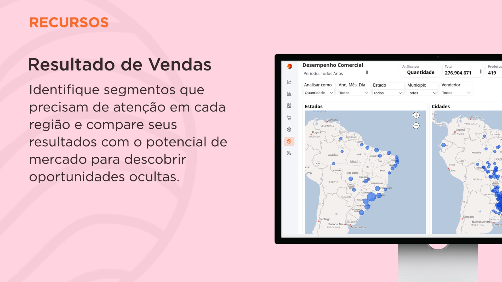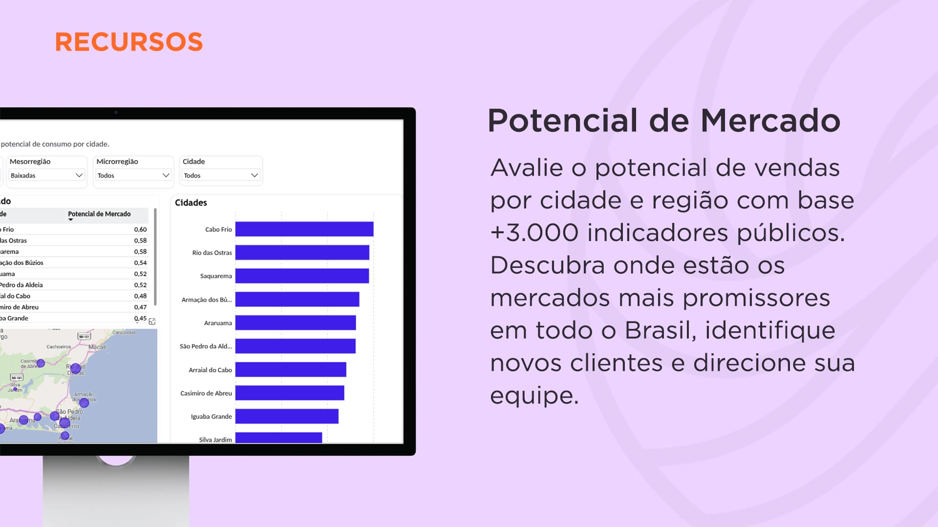 Plataforma de inteligência comercial, baseada em +3.000 indicadores públicos, que mapeia o potencial de mercado por cidade e região, define o perfil ideal de cliente (ICP), gera e qualifica leads com IA, segmenta sua base para novas ações comerciais e prevê vendas para orientar seu planejamento estratégico.